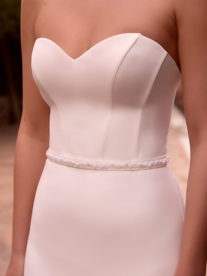 Zarter Brautgürtel aus feinem Tüll, geschmückt mit kleinen Perlen. Mit einer Breite von 1 cm und einer Länge von 275 cm lässt er sich individuell am Rücken binden. Die sorgfältige Verarbeitung und die dezenten Details verleihen dem Accessoire eine elegante, zurückhaltende Note.