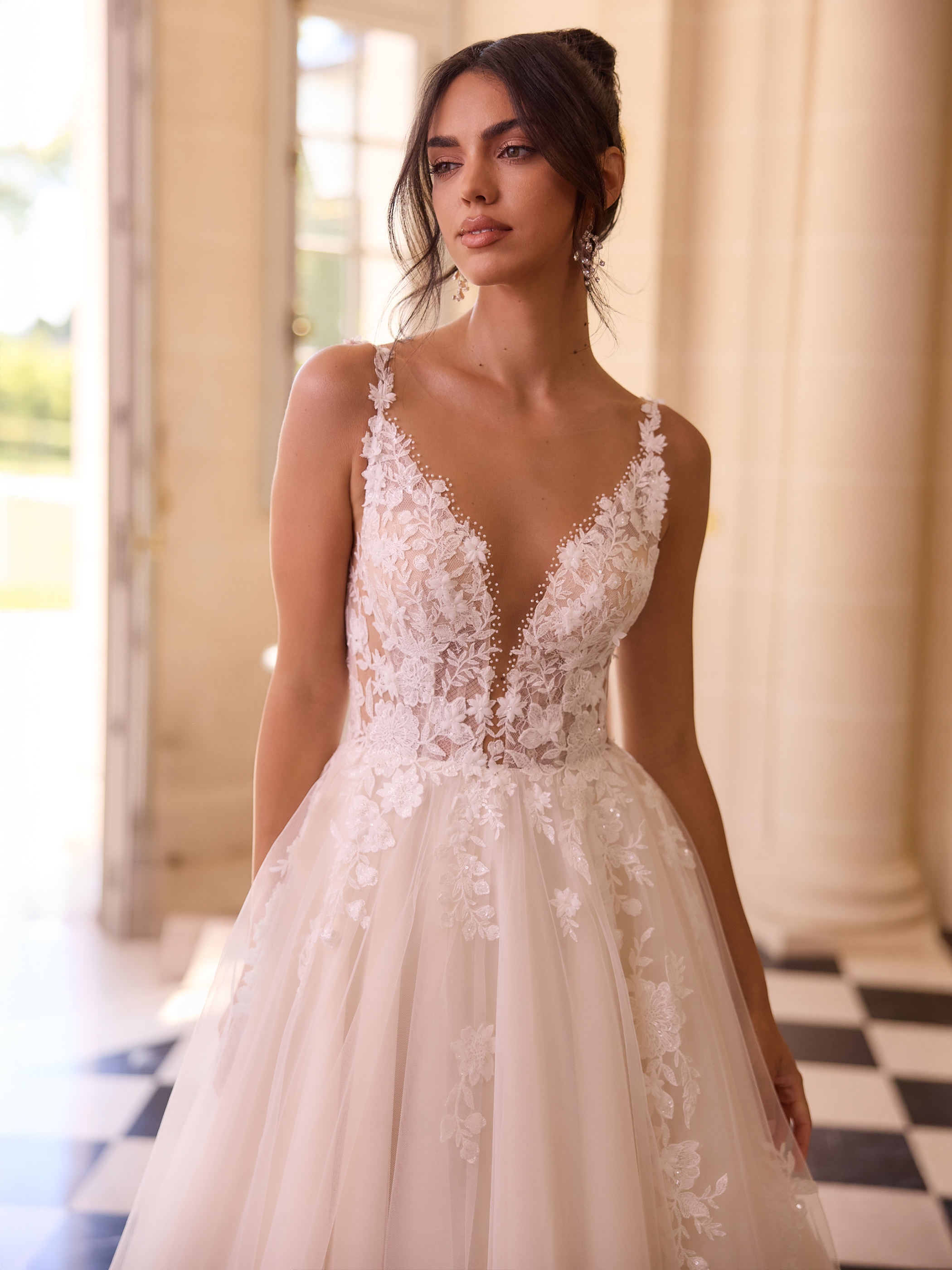 Modern, klar, selbstbewusst: Dieses bodenlange Prinzessinnen-Brautkleid aus edler Spitze und funkelndem Kristalltüll betont eine natürliche Taille und setzt mit transparentem V-Rückenausschnitt ein luxuriöses Statement. Der V-Ausschnitt mit Illusion-Effekt und das ärmellose Design unterstreichen die moderne Eleganz. Handgestickte Spitzendetails und eine prachtvolle, vollständig bestickte Schleppe verleihen dem Look royale Ausstrahlung. Der Rücken schließt mit einem Reißverschluss. Ideal für klassische Schlossfeiern, festliche Trauungen oder elegante Hochzeitszeremonien.