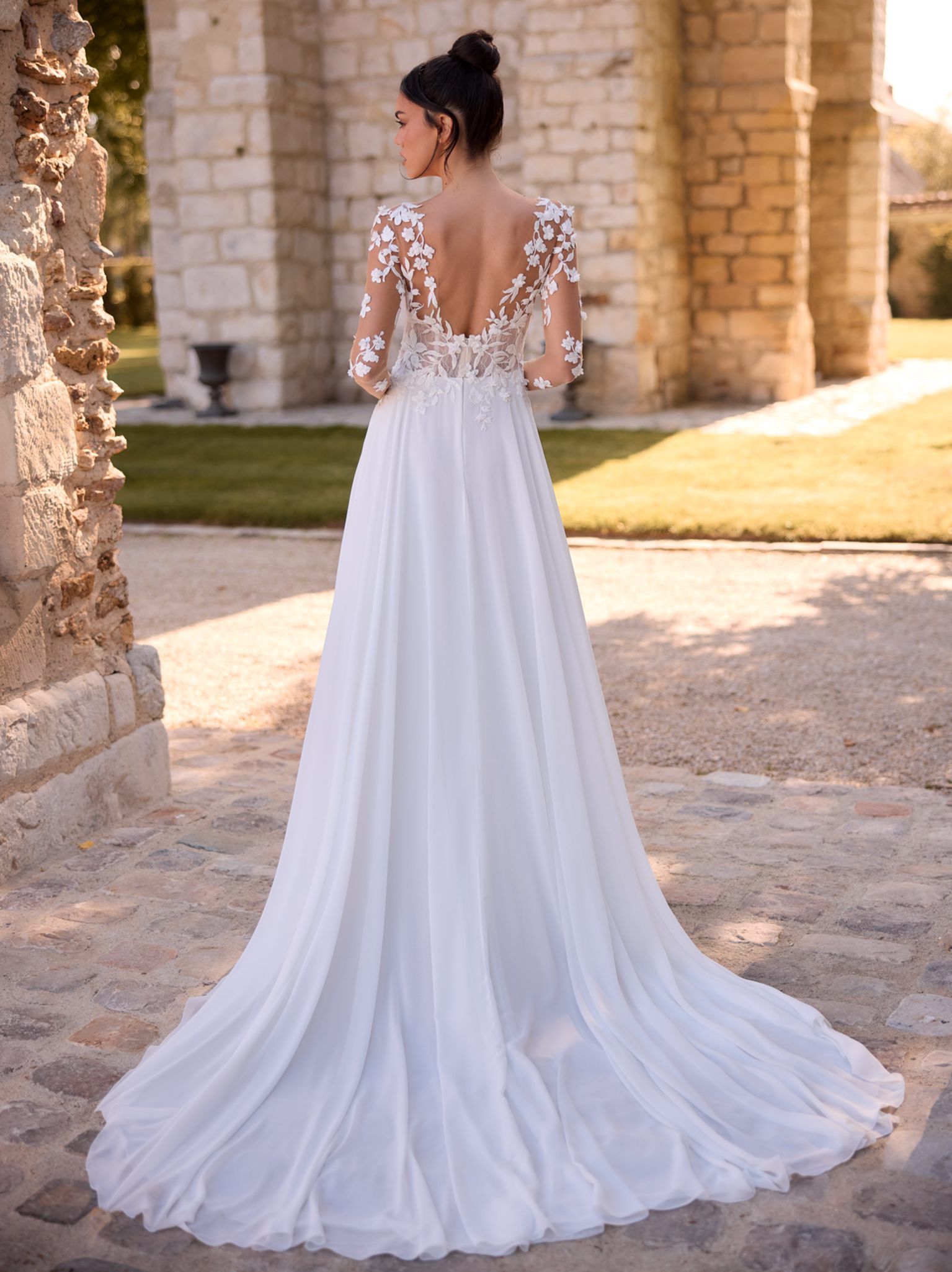 Modern, klar, selbstbewusst: Dieses bodenlange Boho-A-Linienkleid aus Chiffon und feiner Spitze betont eine natürliche Taille und setzt mit transparentem, geradem Rücken ein edles Statement. Der V-Ausschnitt und die langen Illusionsärmel verleihen dem Design feminine Eleganz. Das Oberteil mit floraler Baumwollspitze wirkt romantisch und detailreich. Eine lange Schleppe rundet den königlichen Look harmonisch ab. Der Rücken schließt mit einem Reißverschluss. Ideal für Boho-Hochzeiten, freie Trauungen oder festliche Sommerfeiern.