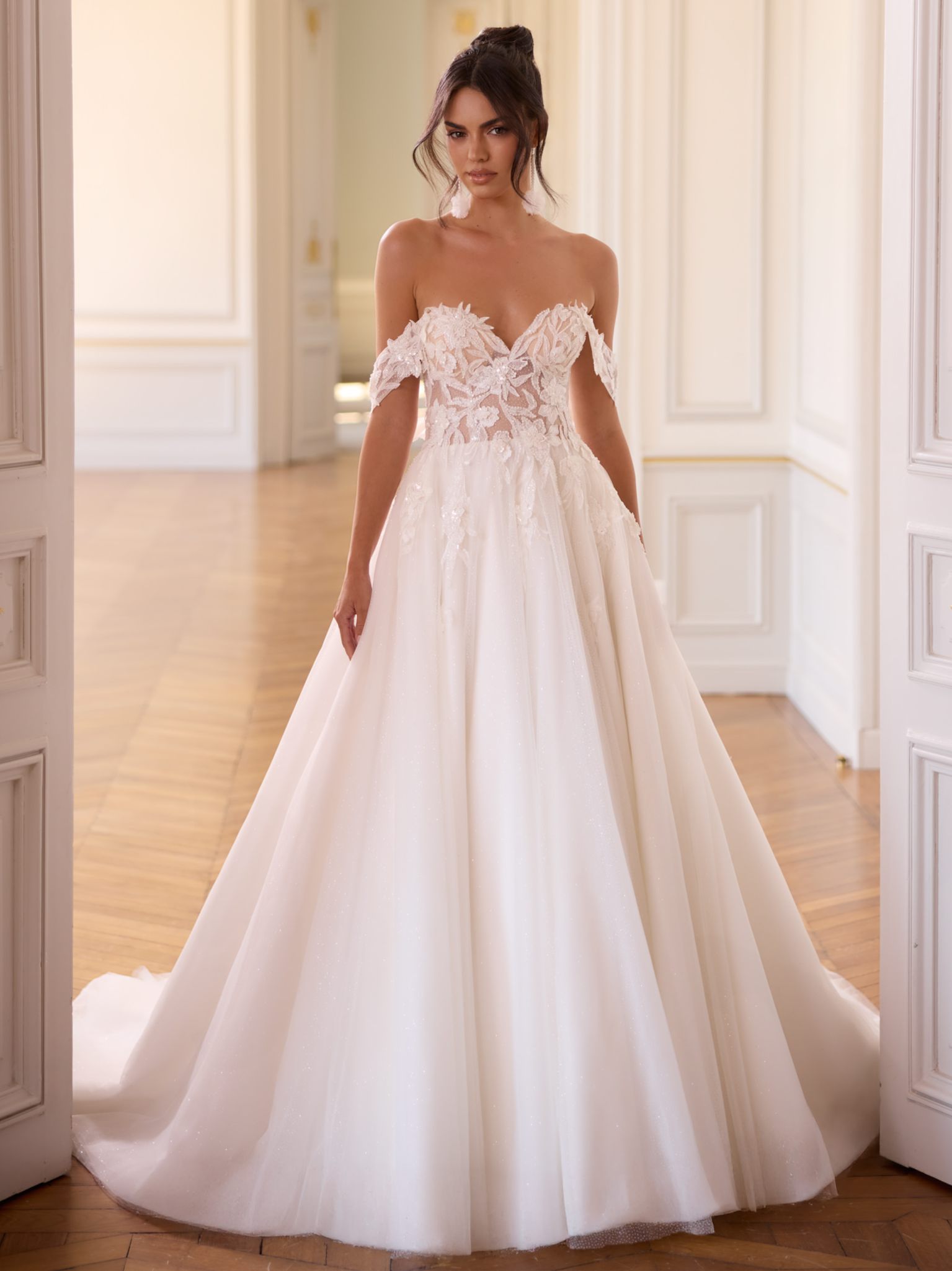 Modern, klar, selbstbewusst: Dieses bodenlange Prinzessinnen-Brautkleid aus hochwertiger Kristallspitze und glitzerndem Tüll betont eine natürliche Taille und setzt mit geradem Rücken ein elegantes Statement. Der schulterfreie Ausschnitt und das ärmellose Design schaffen eine feminine Linienführung. Die lange Schleppe sorgt für einen eindrucksvollen Auftritt. Das Oberteil ist mit floraler Kristallspitze bestickt und zeigt feine Details. Der Rücken schließt mit einem Reißverschluss, akzentuiert durch Kristallknöpfe. Ideal für klassische Zeremonien, repräsentative Empfänge oder märchenhafte Hochzeiten.