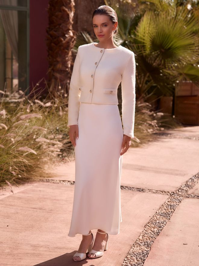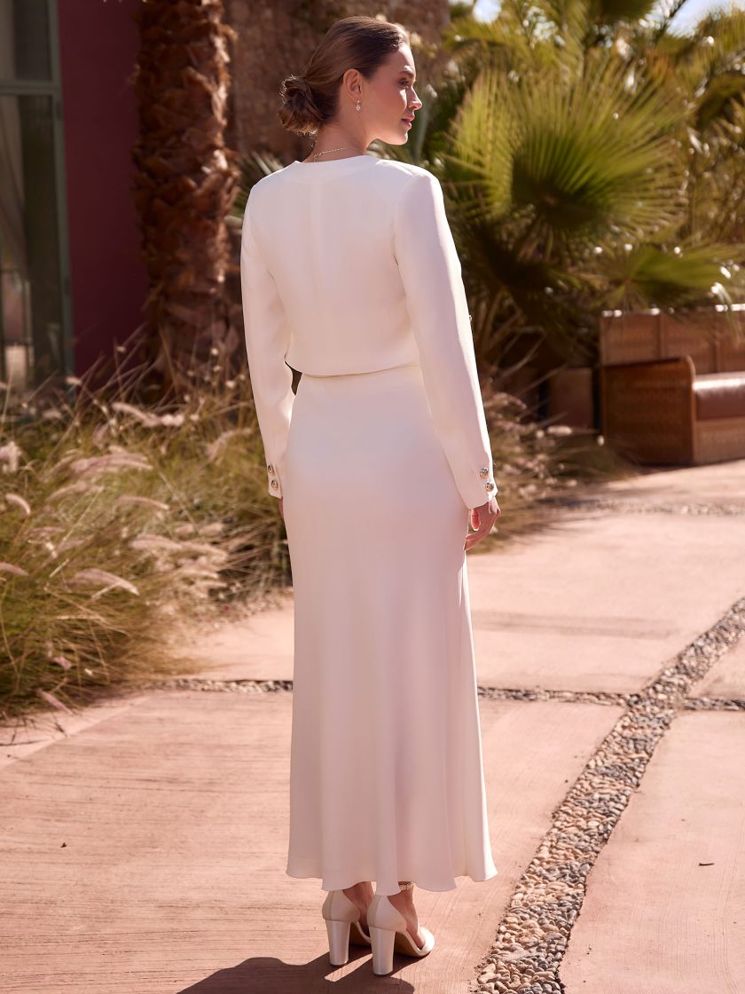 Moderne Brautjacke aus feinem Stretch-Crepe mit eleganter Struktur. Der offene Ausschnitt verleiht ihr eine klare, zeitlose Silhouette. Mit ihren langen Ärmeln ist sie die perfekte Ergänzung für eine standesamtliche Hochzeit und rundet den Braut-Look stilvoll ab.