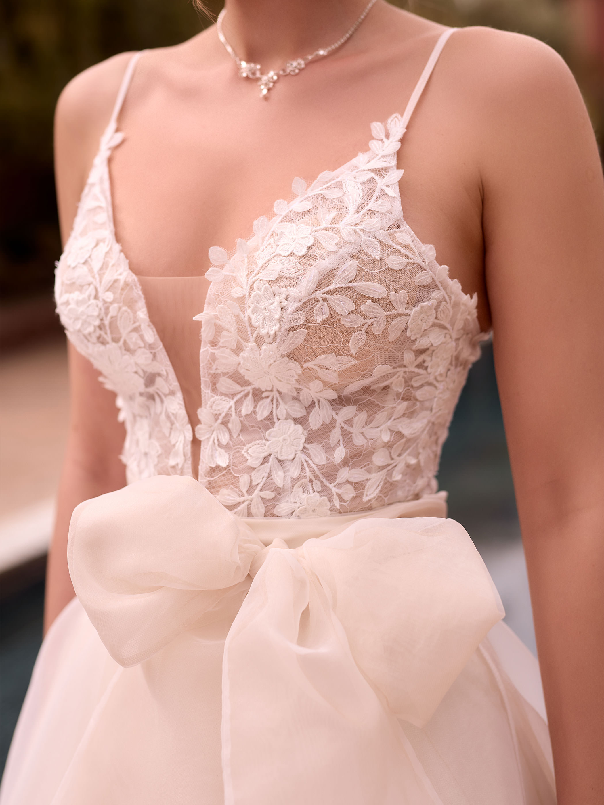 Modern, klar, selbstbewusst: SONJA spielt mit Transparenzen und Leichtigkeit – eine Lage Organza, dazu Nude-Tüll und reiner Tüll erzeugen ein edles, schwebendes Volumen. Eine dekorative Schleife auf der Vorderseite setzt einen stilvollen Fokus. Der rückseitige Reißverschluss sorgt für eine passgenaue Silhouette und unkompliziertes Anziehen. Ideal für Mix-&-Match mit Corsage, Top oder Pullover – perfekt fürs Standesamt, die Gartenhochzeit oder als zweiter Look am Abend.