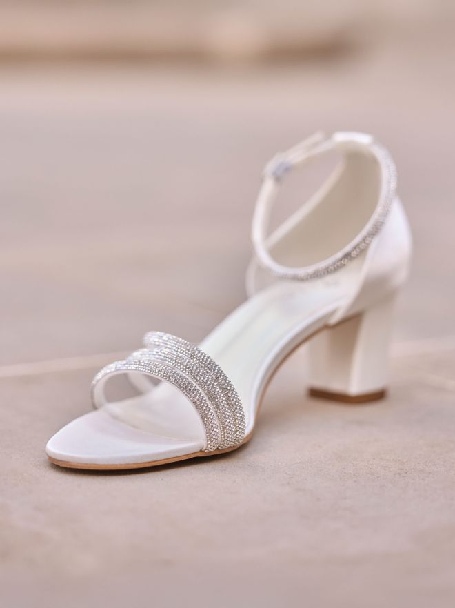 Modern, klar, selbstbewusst: Diese Braut-Sandale aus edlem Satin überzeugt mit einem breiten 9 cm Absatz, der Stabilität und Eleganz vereint. Der schmale Riemenverschluss sorgt für sicheren Halt und angenehmen Tragekomfort – perfekt für den Hochzeitstag und lange Tanznächte.