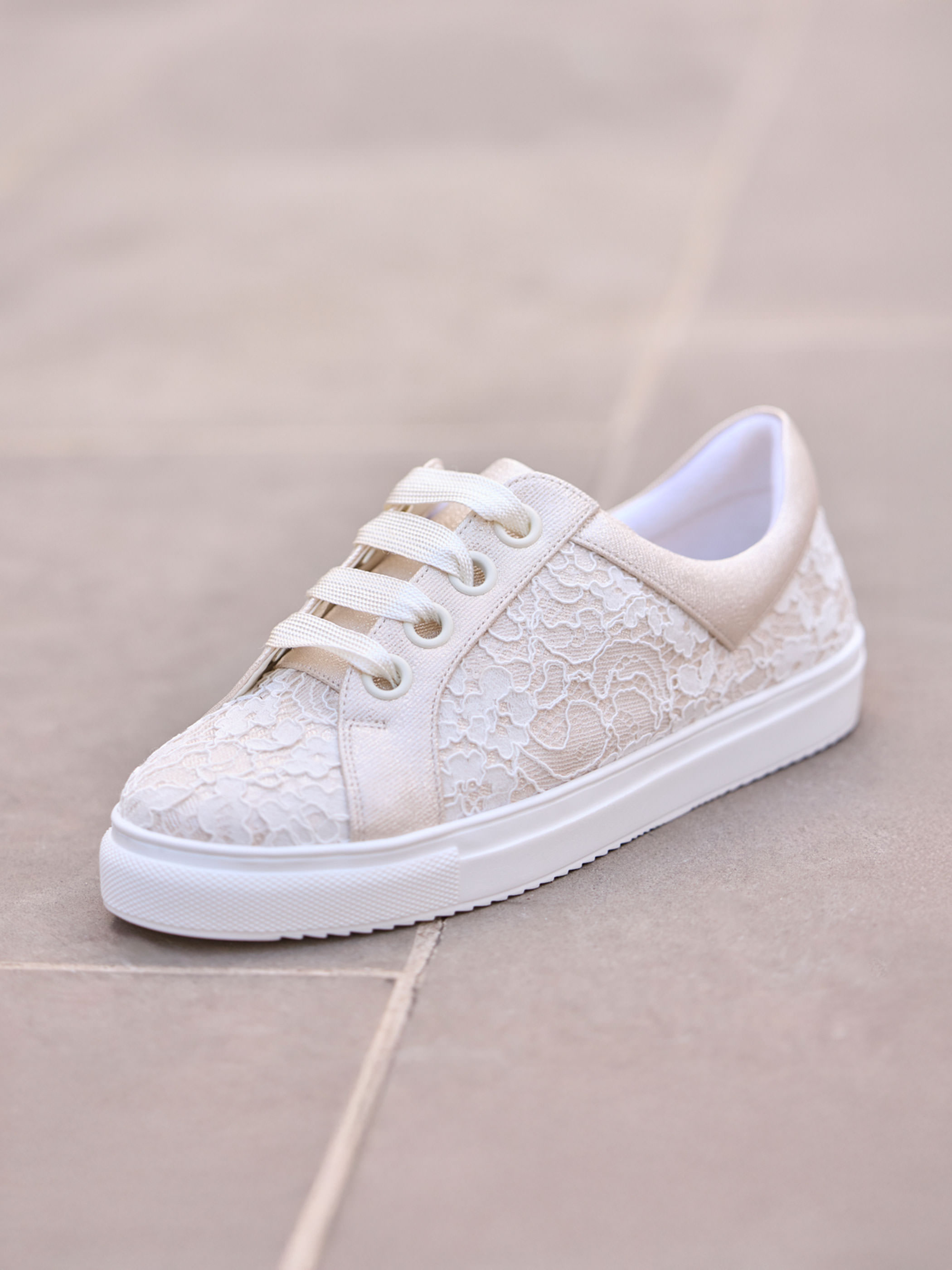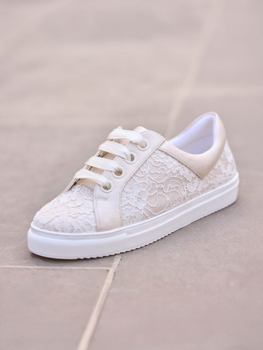 Modern, klar, selbstbewusst: Dieser Braut-Sneaker aus feiner Spitze und strapazierfähigem synthetischem Material verbindet Stil und Komfort. Ideal, um nach einem langen Tag entspannt weiterzufeiern, ohne auf Eleganz zu verzichten. Die weiche Schaumstoff-Innensohle sorgt für höchsten Tragekomfort – perfekt für die Hochzeitsnacht oder den zweiten Look am Abend.
